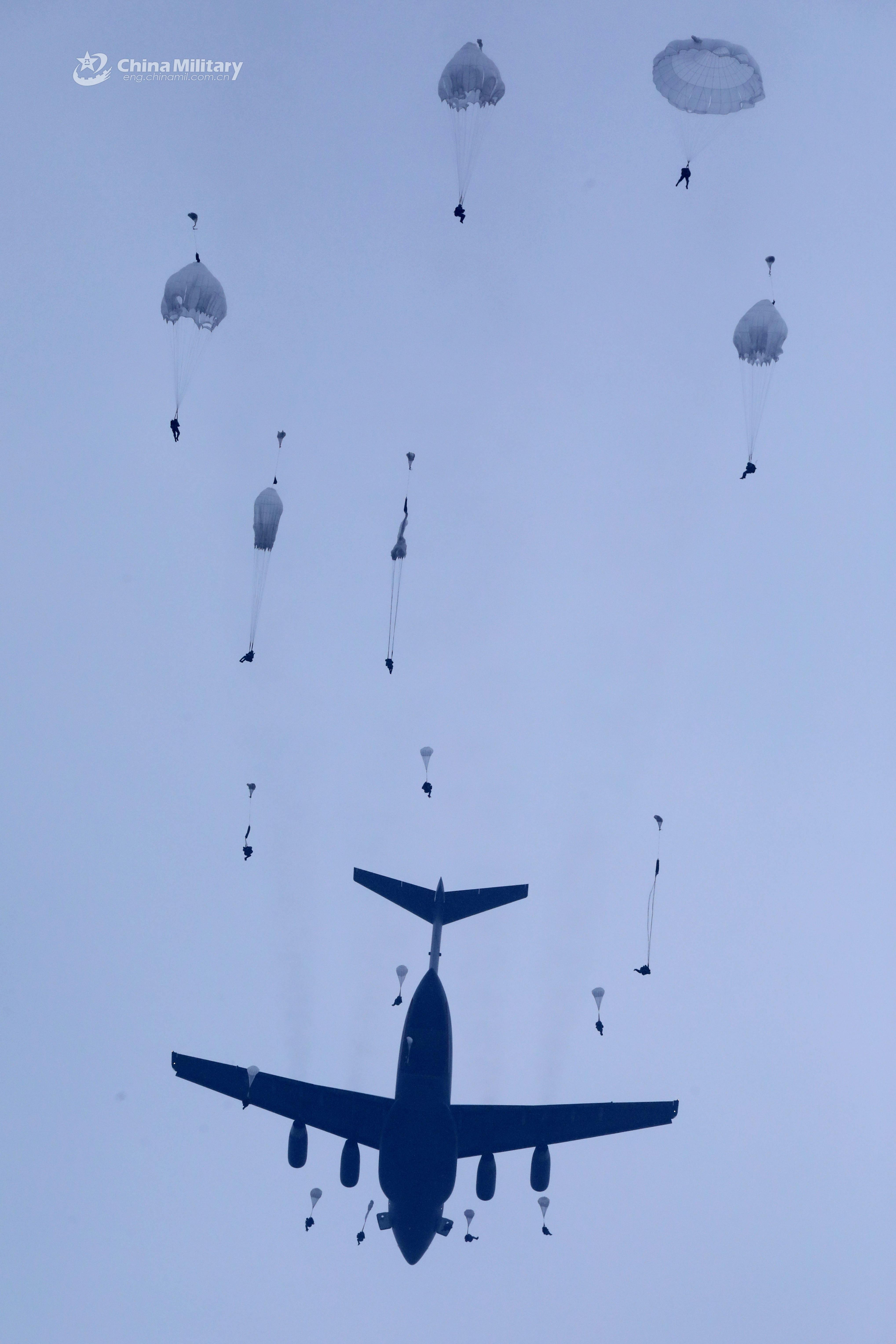 Paratroopers assigned to a brigade with the PLA airborne troops jump out from the back of a transport helicopter in sequence during a parachute training exercise on February 17, 2022. (eng.chinamil.com.cn/Photo by Liu Bingbing)