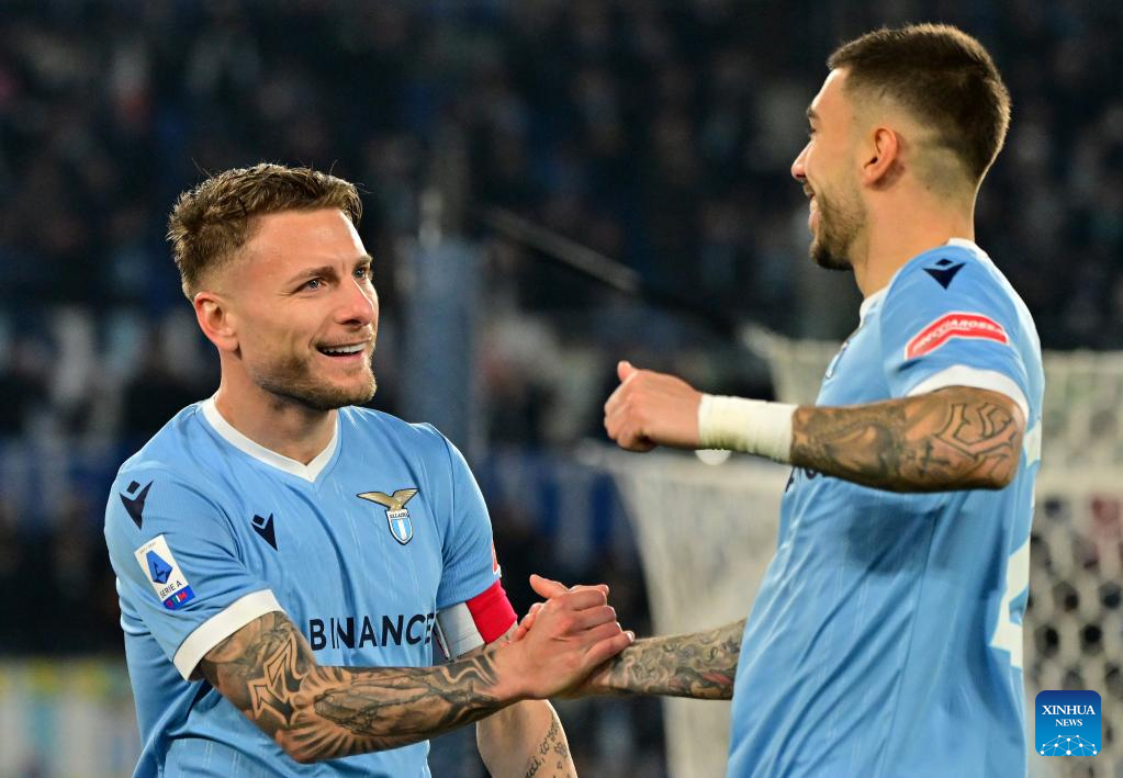 Lazio's Ciro Immobile (L) celebrates his goal with his teammate during a Serie A football match between Lazio and Venezia in Rome, Italy, March 14, 2022. (Photo by Alberto Lingria/Xinhua)