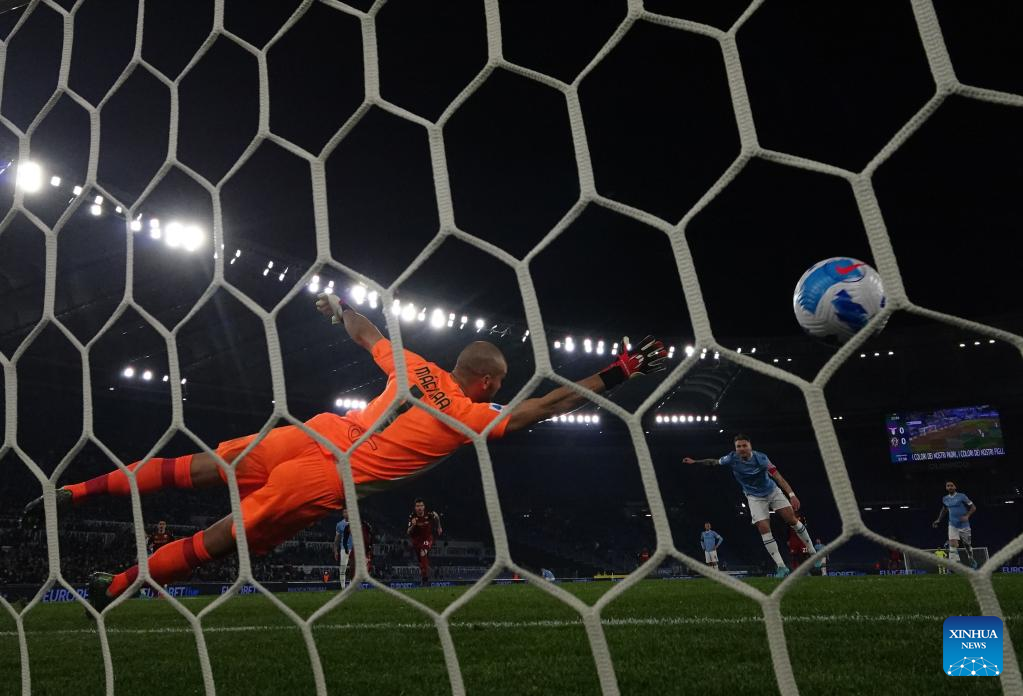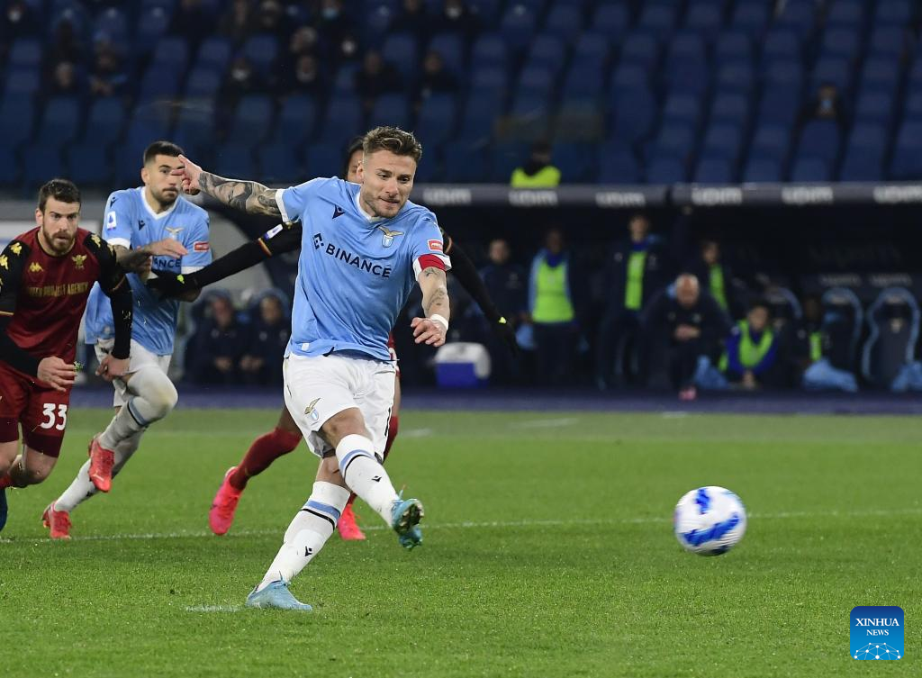Lazio's Ciro Immobile (2nd R) shoots a penalty kick during a Serie A football match between Lazio and Venezia in Rome, Italy, March 14, 2022. (Photo by Alberto Lingria/Xinhua)