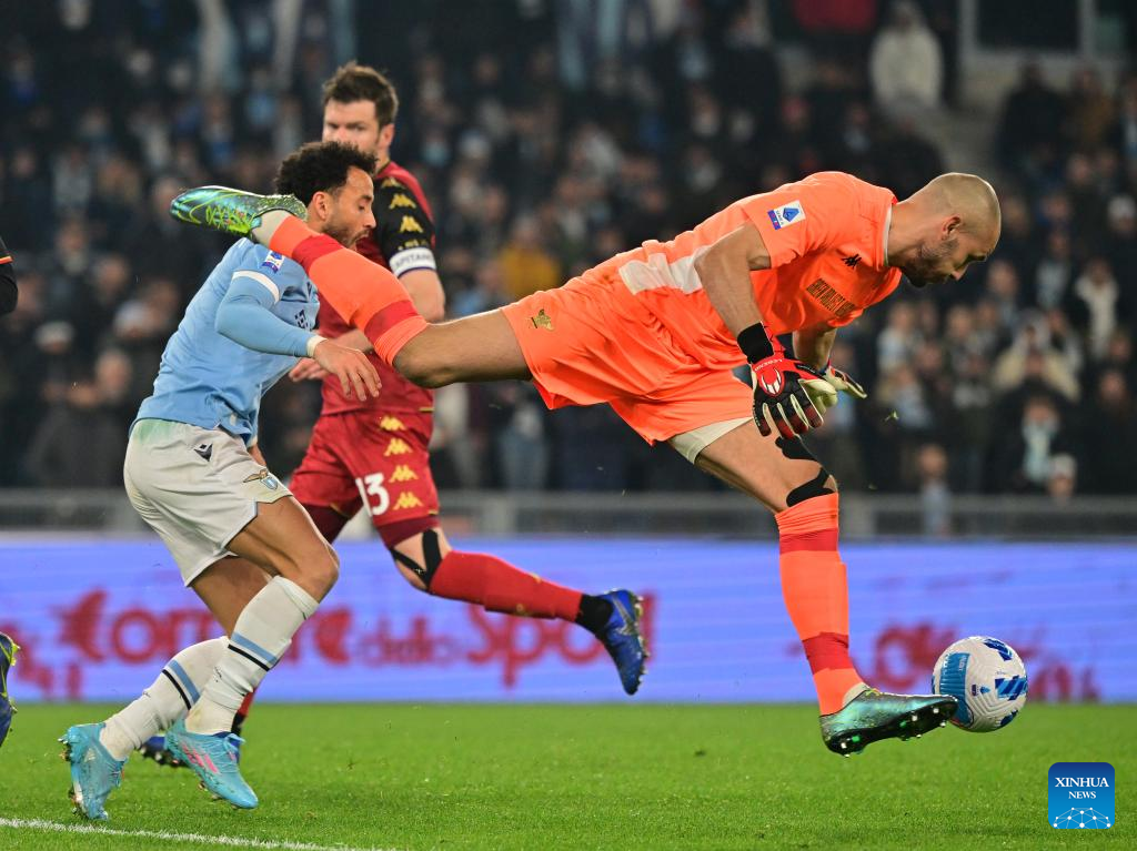 Lazio's Felipe Anderson (L) vies with Venezia's Niki Maenpaa during a Serie A football match between Lazio and Venezia in Rome, Italy, March 14, 2022. (Photo by Alberto Lingria/Xinhua)