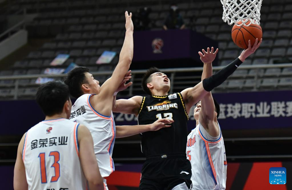 Fu Hao (R) of Liaoning Flying Leopards competes during the 35th round match between Liaoning Flying Leopards and Sichuan Blue Whales at the 2021-2022 season of the Chinese Basketball Association (CBA) league in Shenyang of northeast China's Liaoning Province, March 15, 2022. (Xinhua/Wang Yijie)