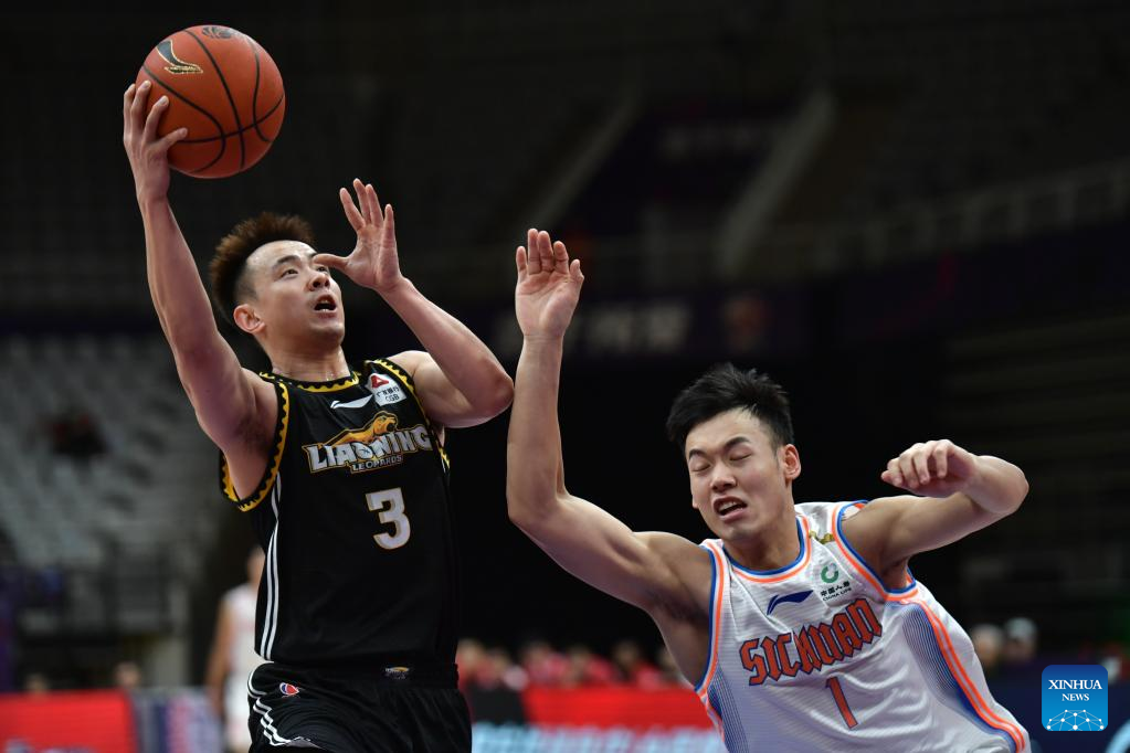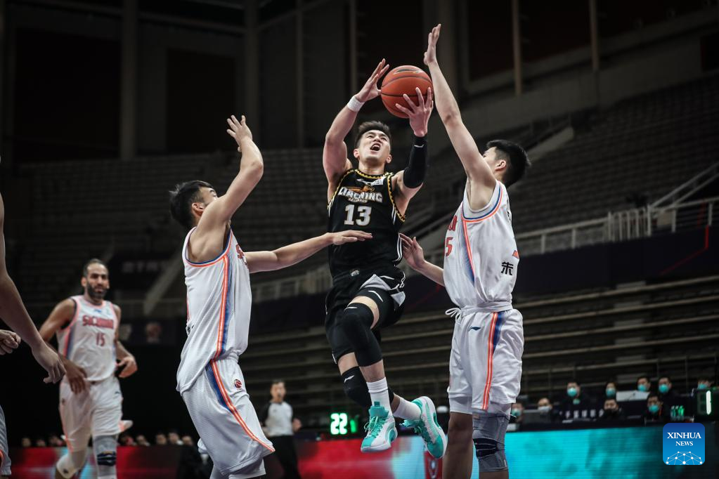 Guo Ailun (2nd R) of Liaoning Flying Leopards competes during the 35th round match between Liaoning Flying Leopards and Sichuan Blue Whales at the 2021-2022 season of the Chinese Basketball Association (CBA) league in Shenyang of northeast China's Liaoning Province, March 15, 2022. (Xinhua/Wang Yijie)