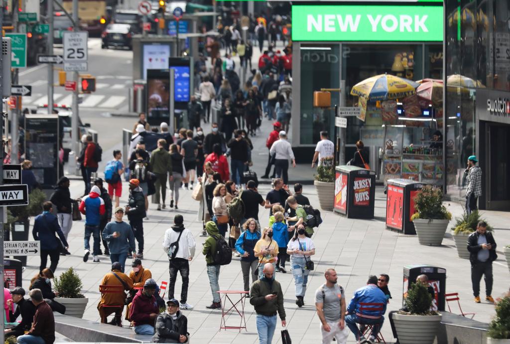 People are seen on Times Square in New York, the United States, March 7, 2022. (Xinhua/Wang Ying)