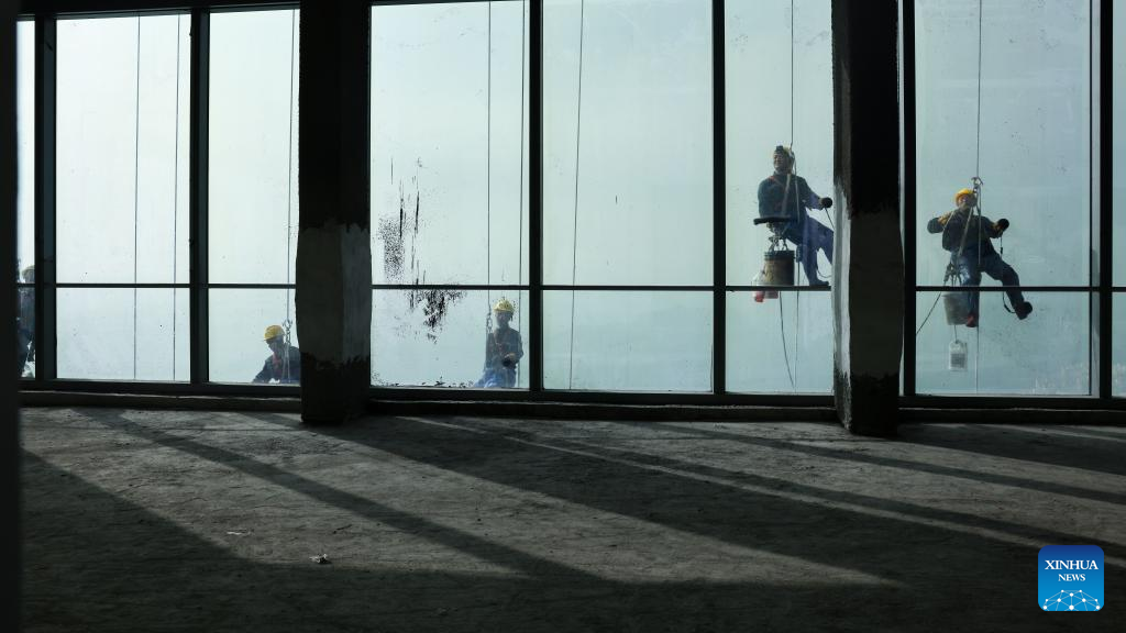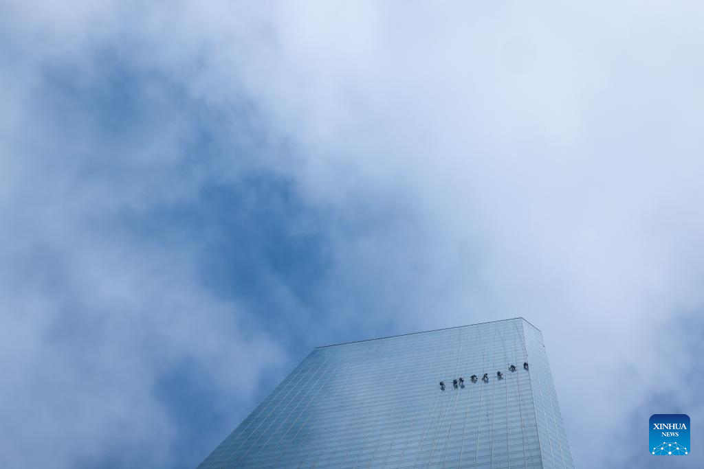 Skyscraper window cleaners clean the exterior of Guiyang International Trade Center in Guiyang, southwest China's Guizhou Province, March 15, 2022. The 335-meter-high twin skyscrapers of Guiyang International Trade Center recently saw their first exterior wall cleaning this year. The cleaning, carried out by eight workers, is expected to take about 20 days. (Xinhua/Ou Dongqu)
