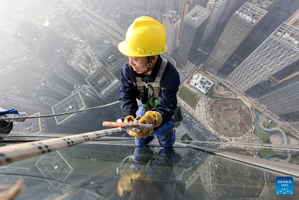 A skyscraper window cleaner prepares to clean the exterior of Guiyang International Trade Center in Guiyang, southwest China's Guizhou Province, March 15, 2022. The 335-meter-high twin skyscrapers of Guiyang International Trade Center recently saw their first exterior wall cleaning this year. The cleaning, carried out by eight workers, is expected to take about 20 days. (Xinhua/Ou Dongqu)