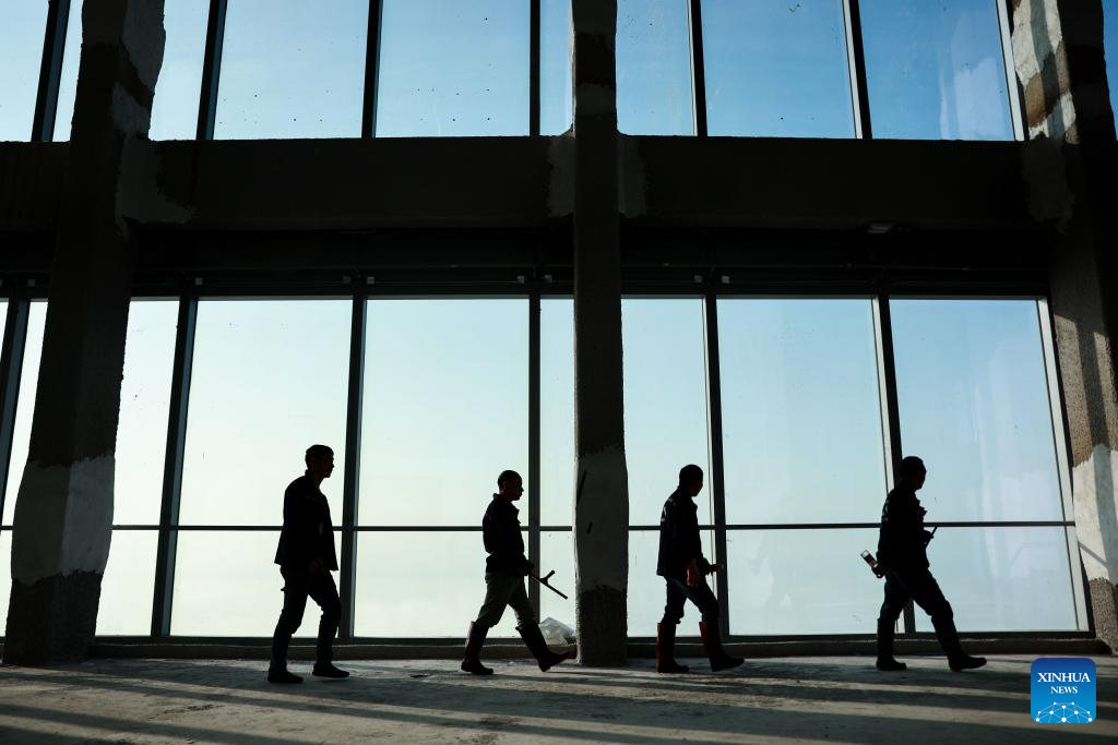 Skyscraper window cleaners head for the exterior cleaning of Guiyang International Trade Center in Guiyang, southwest China's Guizhou Province, March 15, 2022. The 335-meter-high twin skyscrapers of Guiyang International Trade Center recently saw their first exterior wall cleaning this year. The cleaning, carried out by eight workers, is expected to take about 20 days. (Xinhua/Ou Dongqu)