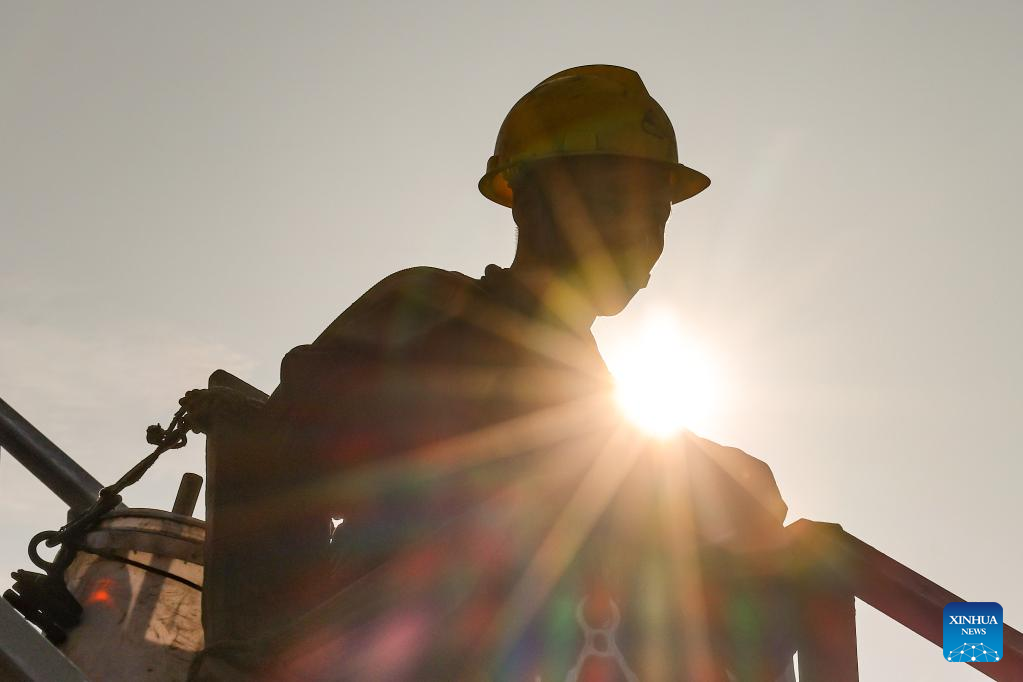 A skyscraper window cleaner fastens his safety harness before cleaning the exterior of Guiyang International Trade Center in Guiyang, southwest China's Guizhou Province, March 15, 2022. The 335-meter-high twin skyscrapers of Guiyang International Trade Center recently saw their first exterior wall cleaning this year. The cleaning, carried out by eight workers, is expected to take about 20 days. (Xinhua/Ou Dongqu)