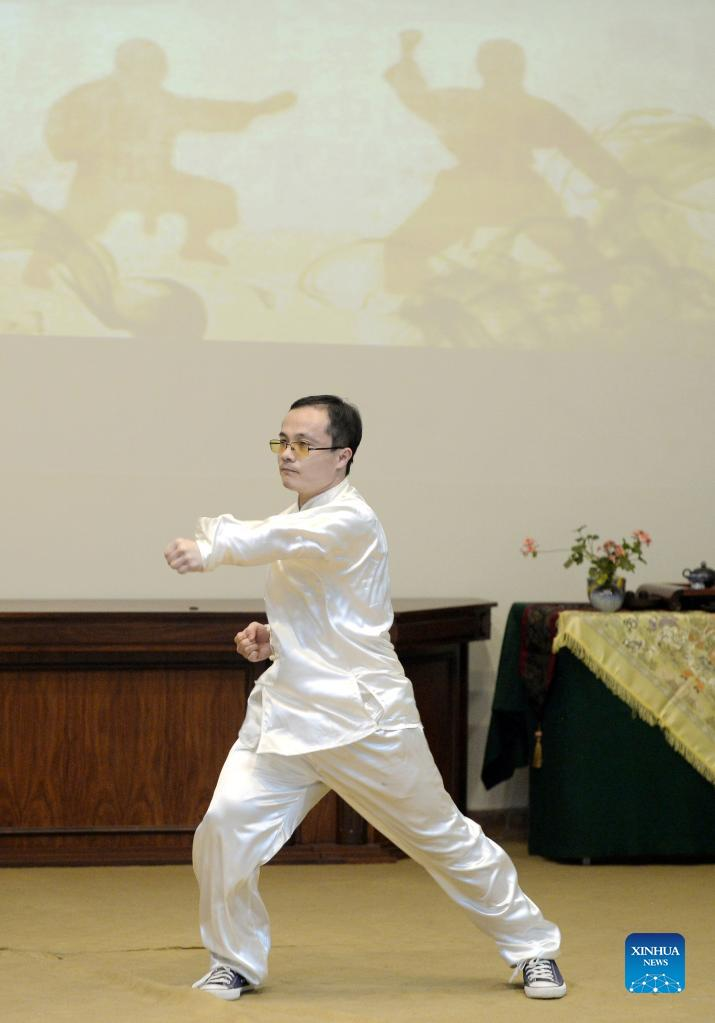 A Chinese teacher performs martial arts during an international cultural festival at the National University of Modern Languages (NUML) in Islamabad, capital of Pakistan on March 14, 2022. (Xinhua/Ahmad Kamal)