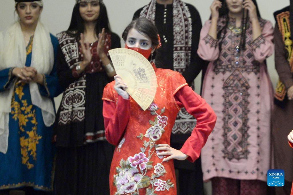 A Pakistani student presents cheongsam, a traditional Chinese women's dress also known as Qipao, during an international cultural festival at the National University of Modern Languages (NUML) in Islamabad, capital of Pakistan on March 14, 2022. (Xinhua/Ahmad Kamal)