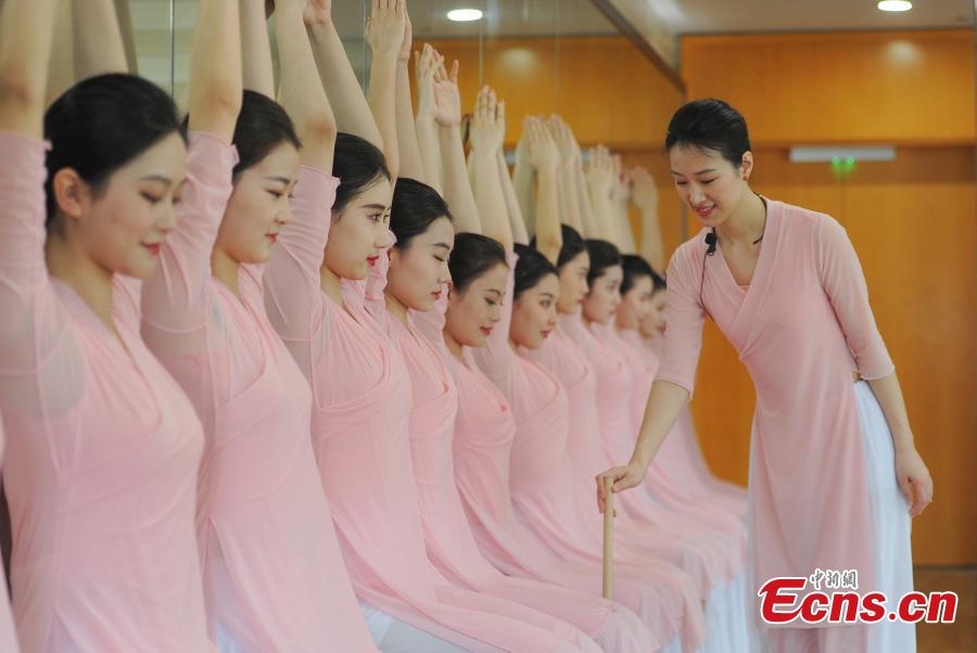 Photo shows flight attendants of Zhejiang Loong Airlines undergoing rigorous posture training, March 14, 2022. A total of 300 flight attendants received an etiquette training, including 13 courses for Hangzhou 2022 Asian Games, which will be held from Sept. 10 to 25, 2022 in Hangzhou, Zhejiang Province. (Photo: China News Service/Wang Gang)