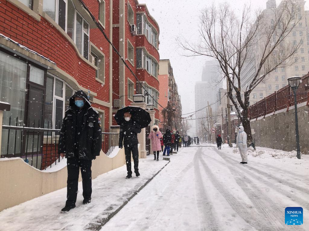 Cellphone photo taken on March 15, 2022 shows residents lining up for nucleic acid test in Changchun, northeast China's Jilin Province, March 15, 2022. Jilin Province reported 3,076 new locally transmitted COVID-19 cases on Monday. (Xinhua/Chu Xiaoliang)