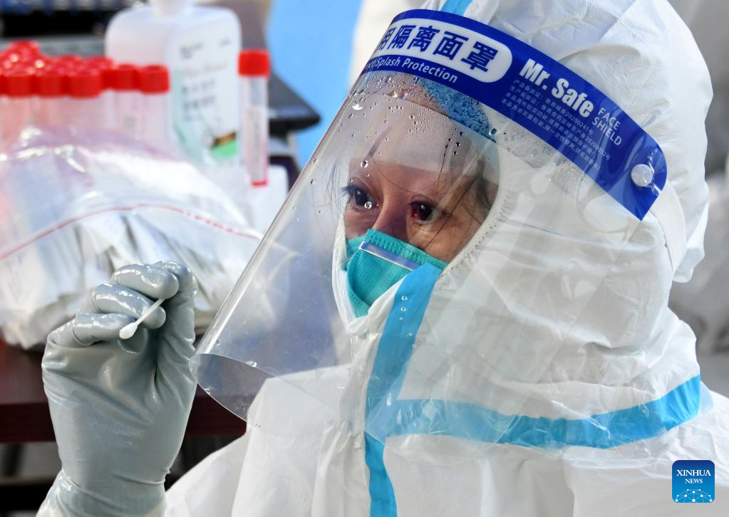 A medical worker takes a swab sample from a resident for nucleic acid test at Shibei District, Qingdao City, east China's Shandong Province, March 15, 2022. Qingdao has strengthened its epidemic prevention and control measures in response to the resurgence of domestically transmitted COVID-19 cases. (Xinhua/Li Ziheng)