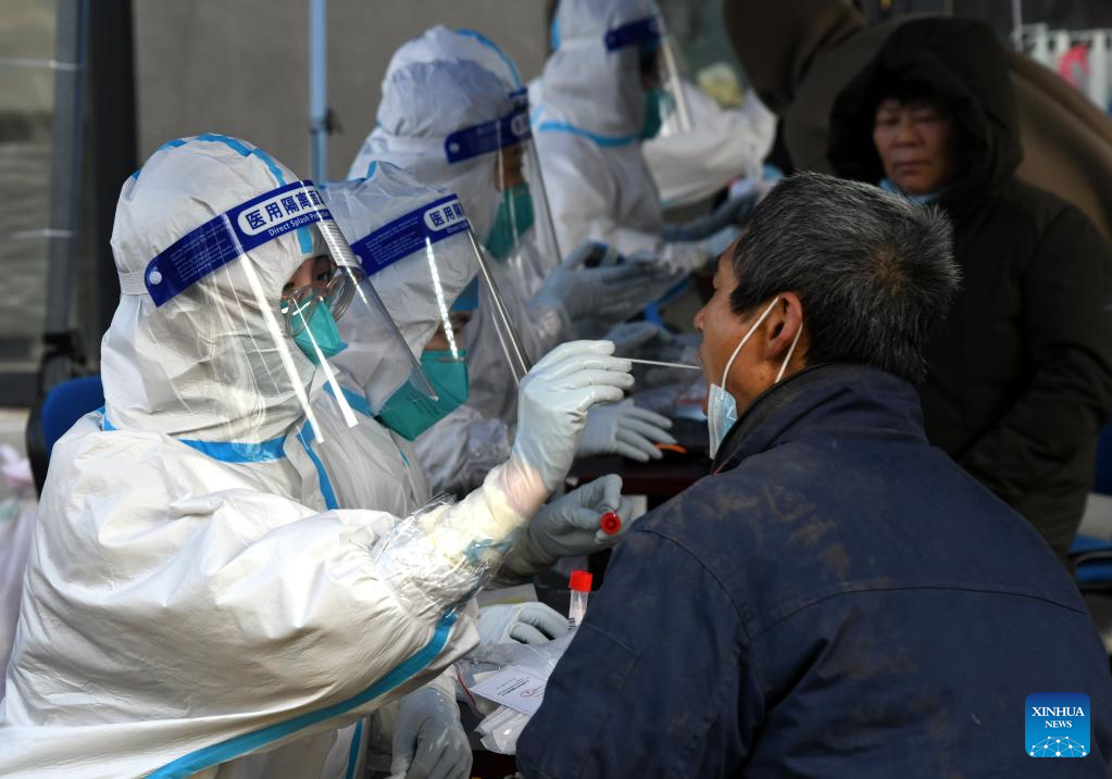 Medical workers take swab samples from people for nucleic acid test at Shibei District, Qingdao City, east China's Shandong Province, March 15, 2022. Qingdao has strengthened its epidemic prevention and control measures in response to the resurgence of domestically transmitted COVID-19 cases. (Xinhua/Li Ziheng)