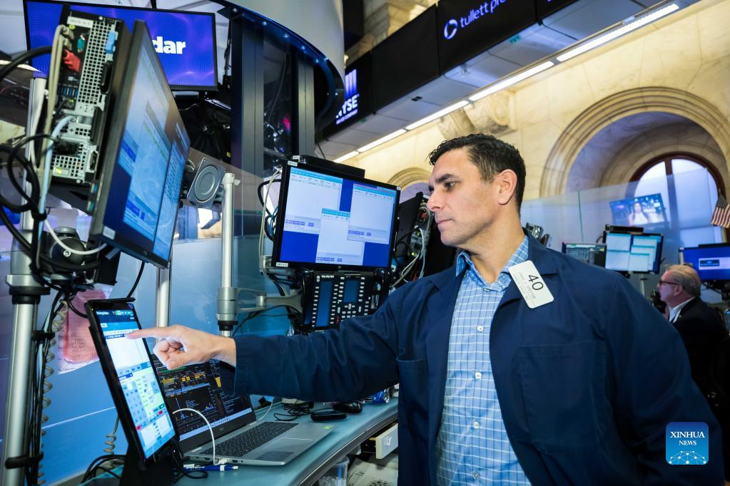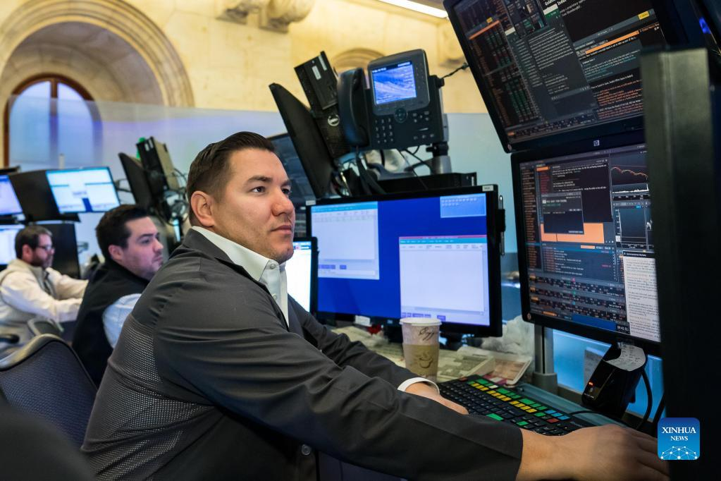 A trader works at the New York Stock Exchange in New York, the United States, March 15, 2022. U.S. stocks rose noticeably on Tuesday, buoyed by a comeback in tech names. The Dow Jones Industrial Average jumped 599.10 points, or 1.82 percent, to 33,544.34. The S&P 500 was up 89.34 points, or 2.14 percent, to 4,262.45. The Nasdaq Composite Index increased 367.40 points, or 2.92 percent, to 12,948.62. (Courtney Crow/NYSE/handout via Xinhua)