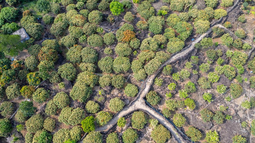 Aerial photo taken on March 15, 2022 shows litchi flowers in Yongxing Township of Haikou City, south China's Hainan Province. (Xinhua/Hu Zhixuan)