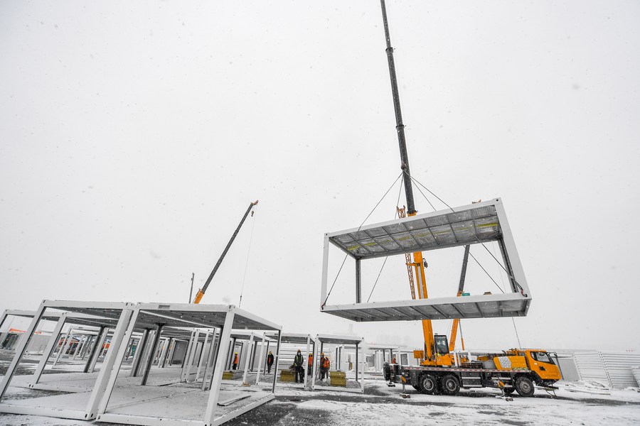 Workers assemble quarantine units amid snow at the construction site of a COVID-19 quarantine center in Jilin City, northeast China's Jilin Province, March 15, 2022. (Xinhua/Zhang Nan)