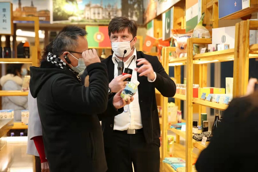 Bekar Mikaberidze (R), founder of Belt and Road Georgian Business House, introduces products to customers in Guangzhou, south China's Guangdong Province, February 2022. (Xinhua)