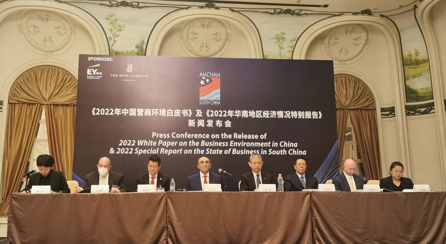 Press conference on the release of 2022 White Paper on the Business Environment in China &2022 Special Report on the State of Business in South China held by the American Chamber of Commerce in South China (AmCham South China), in Guangzhou, south China's Guangdong Province, on March 1, 2022. (Xinhua/Ding Le)
