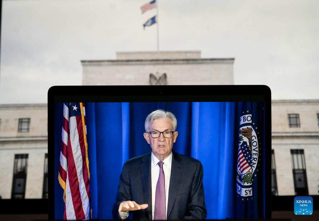 Photo taken in Arlington, the United States, on March 16, 2022 shows a screen displaying U.S. Federal Reserve Chairman Jerome Powell speaking during a virtual press conference. (Xinhua/Liu Jie)