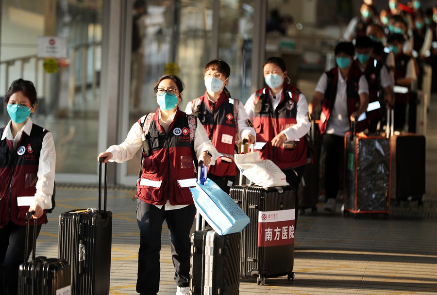 The latest batch of the Chinese mainland medical staff arrive in Hong Kong, south China, March 14, 2022, to support the local fight against the COVID-19 epidemic. (Xinhua/Li Gang)