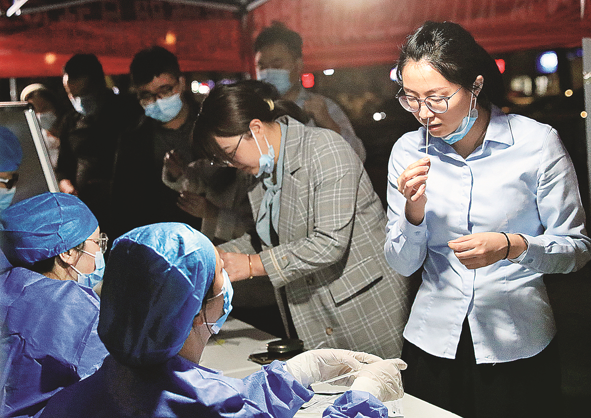 A resident of Hangzhou, Zhejiang province, takes a free COVID-19 antigen self-test in Hangzhou, Zhejiang province, on Tuesday. [ZHANG XIANGRONG/FOR CHINA DAILY]