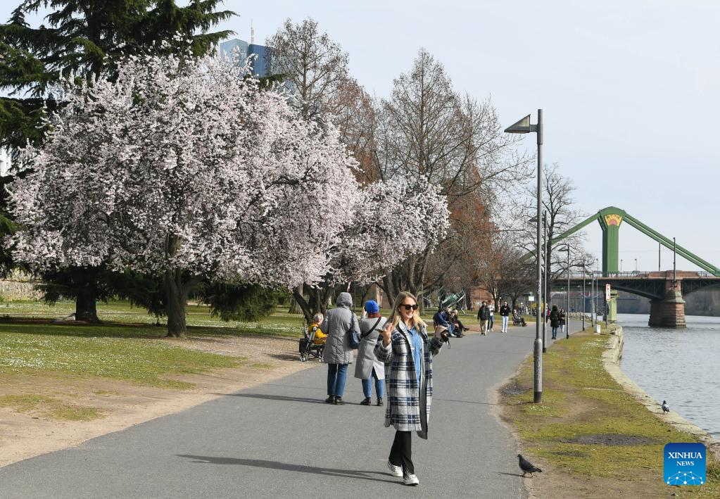 People enjoy spring time on the bank of the Main River in Frankfurt, Germany, on March 16, 2022. (Xinhua/Lu Yang)
