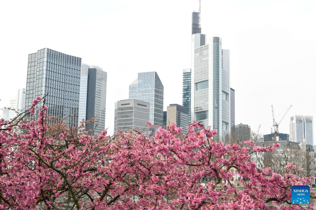 Flowers blossom on the bank of the Main River in Frankfurt, Germany, on March 16, 2022. (Xinhua/Lu Yang)