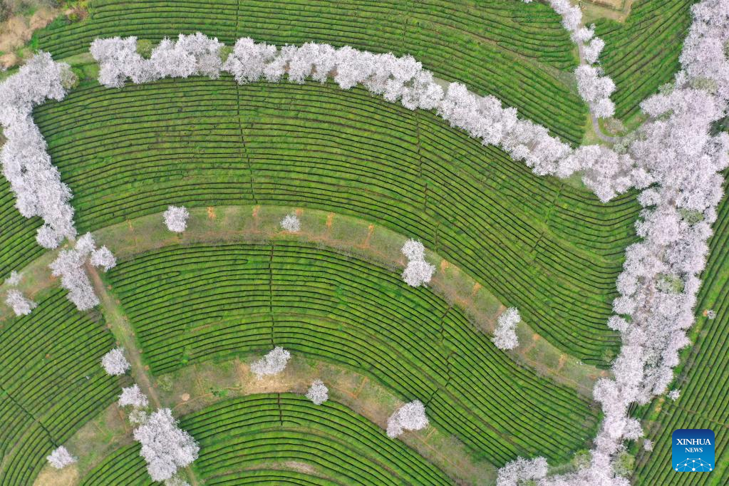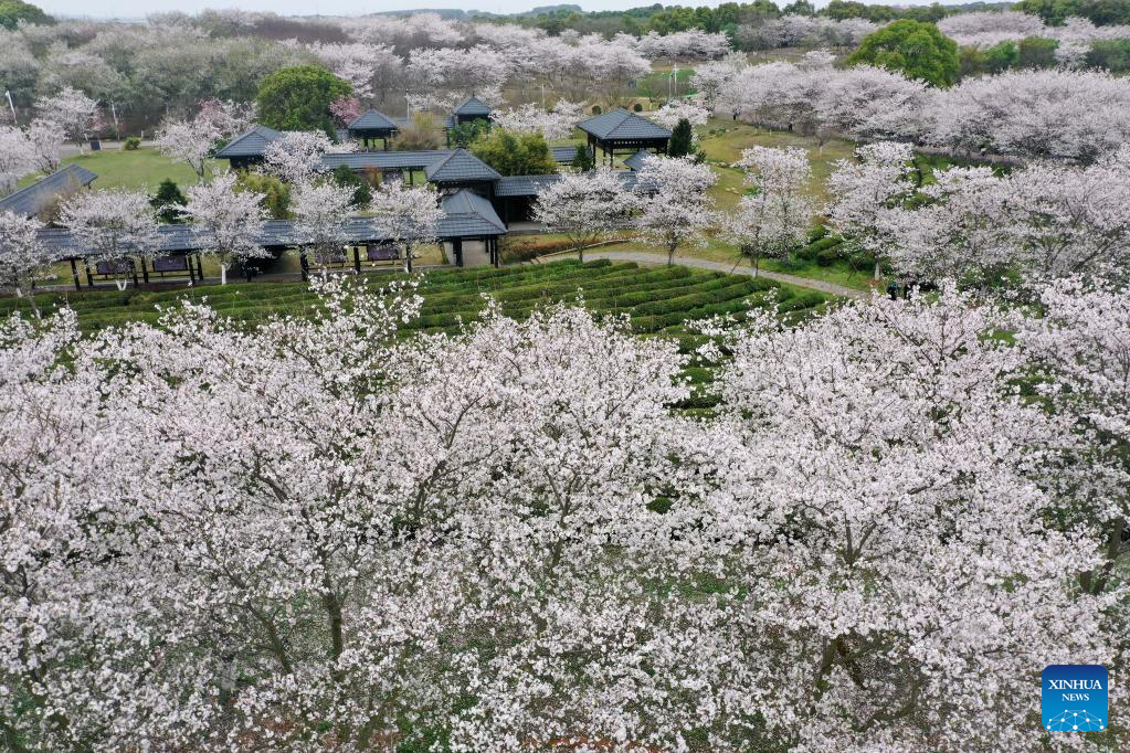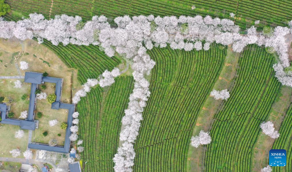 Aerial photo taken on March 16, 2022 shows blossoms at Fenghuanggou scenic area in Nanchang County of east China's Jiangxi Province. (Xinhua/Peng Zhaozhi)