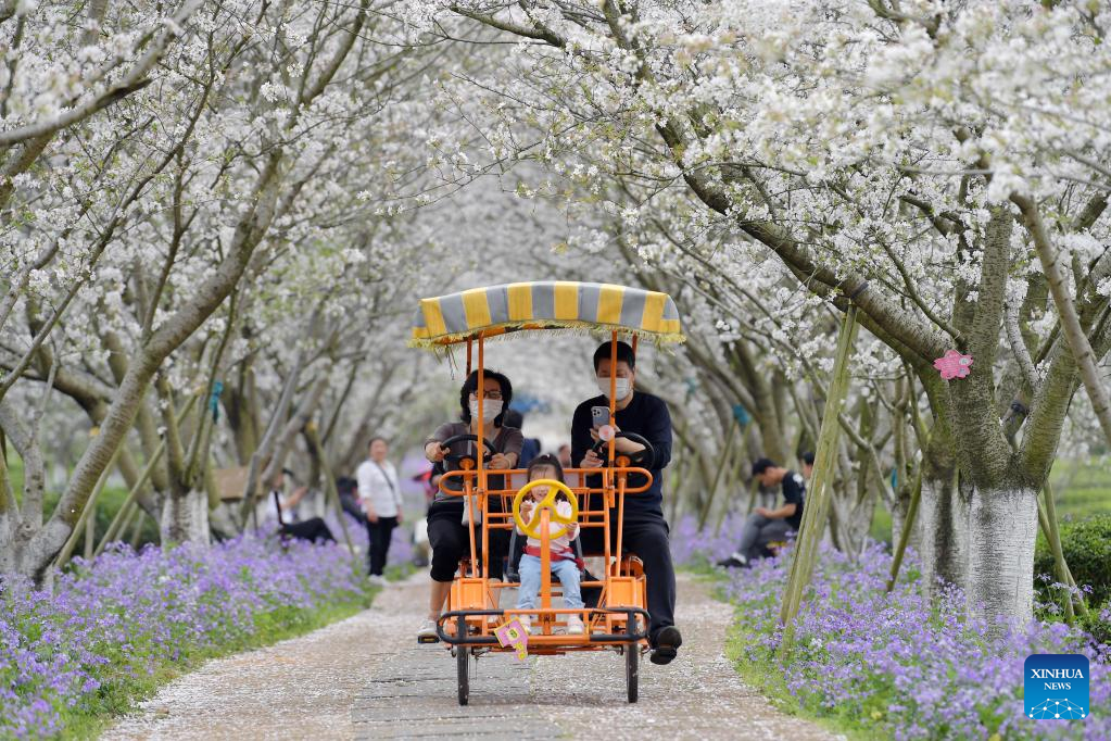 Tourists go sightseeing at Fenghuanggou scenic area in Nanchang County of east China's Jiangxi Province, March 16, 2022. (Xinhua/Peng Zhaozhi)