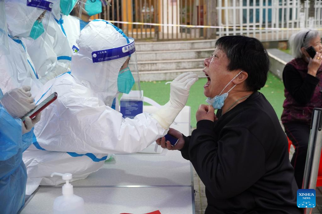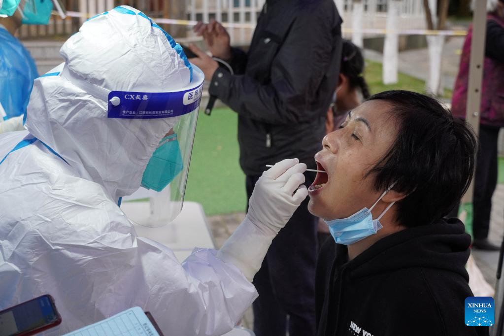 A medical worker takes a swab sample for nucleic acid testing at a residential area in Honggutan District of Nanchang, east China's Jiangxi Province, March 17, 2022. Nanchang carried out mass COVID-19 testing for citizens on Thursday. (Xinhua/Peng Zhaozhi)