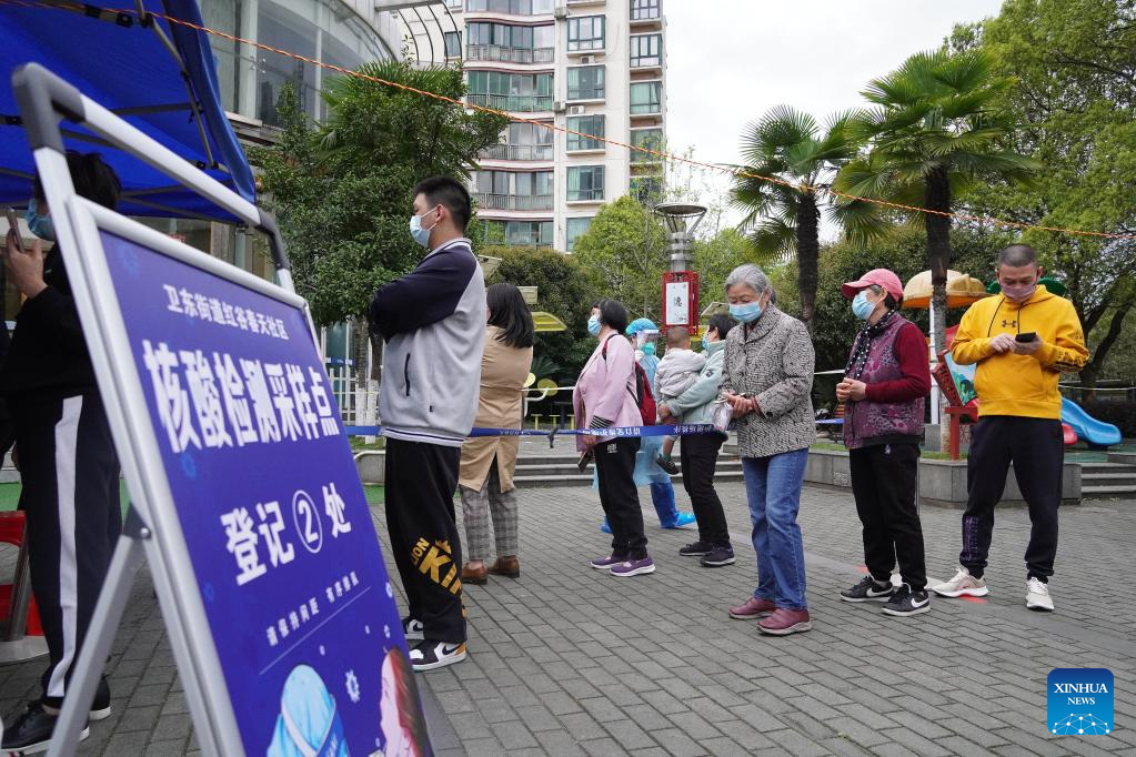 People queue up for nucleic acid testing at a residential area in Honggutan District of Nanchang, east China's Jiangxi Province, March 17, 2022. Nanchang carried out mass COVID-19 testing for citizens on Thursday. (Xinhua/Peng Zhaozhi)