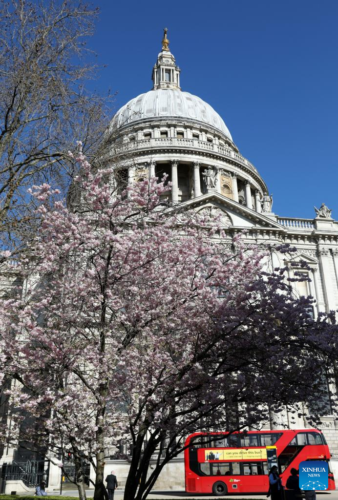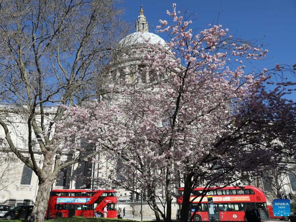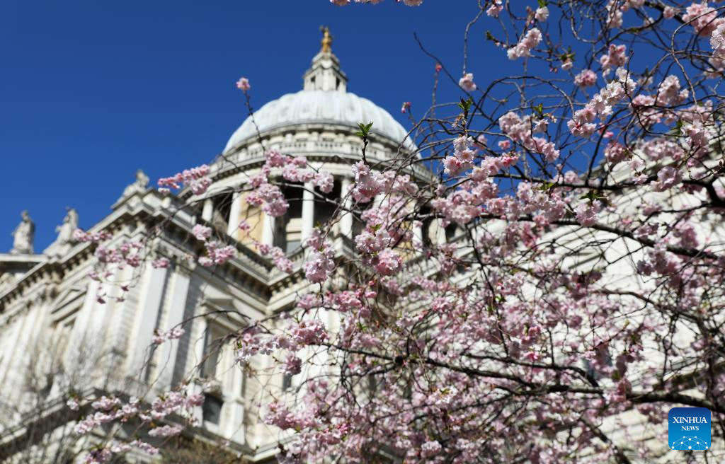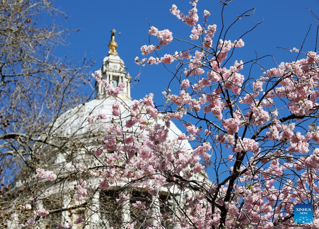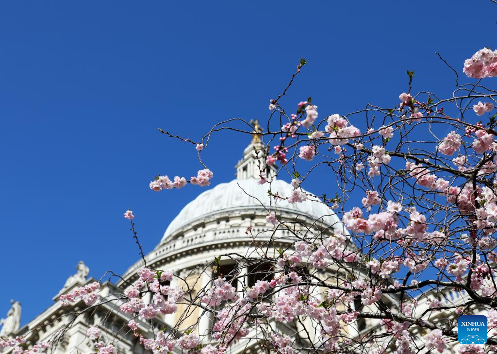 Blooming flowers are seen near St Paul's Cathedral in London, Britain, March 17, 2022. (Xinhua/Li Ying)