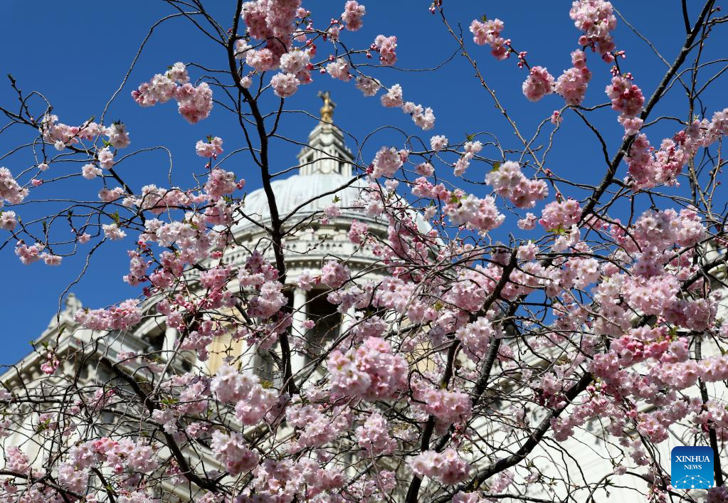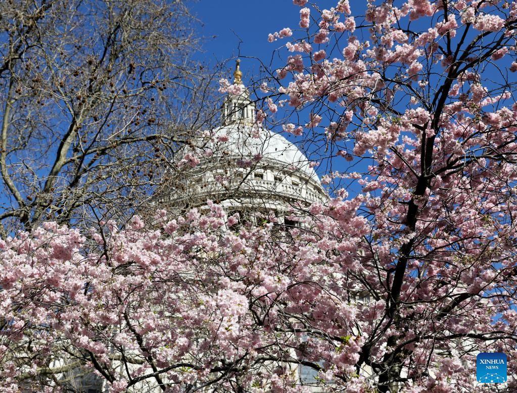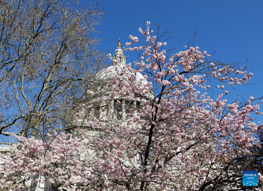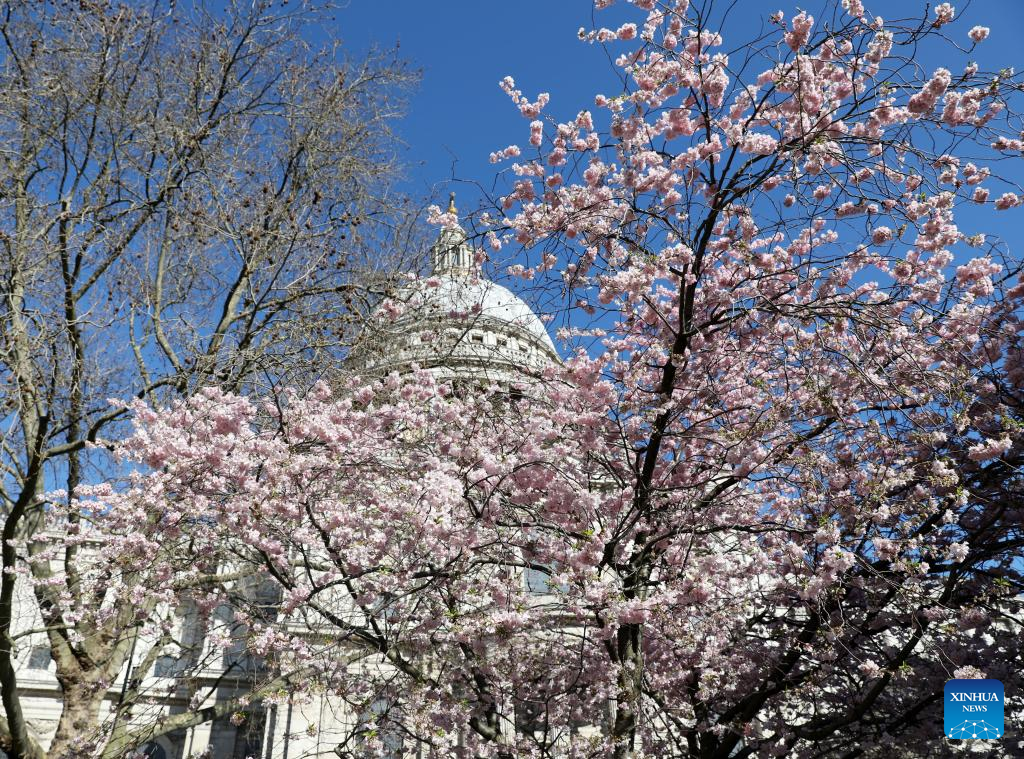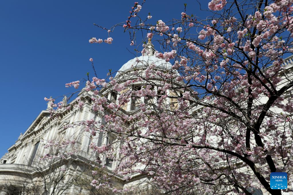Blooming flowers are seen near St Paul's Cathedral in London, Britain, March 17, 2022. (Xinhua/Li Ying)