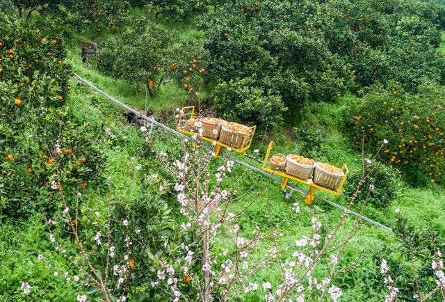 With a few simple clicks, the electric vehicles will drive to the orchard under the slopes from the roadside. After farmers load boxes of navel oranges onto the vehicles, they will then travel back along the rails in several minutes.