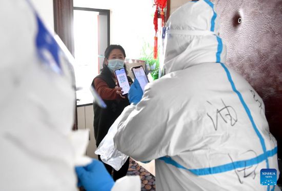 A medical worker registers information for a resident to conduct nucleic acid test at a community of Jiutai District in Changchun, northeast China's Jilin Province, March 18, 2022. (Xinhua/Zhang Boyu)