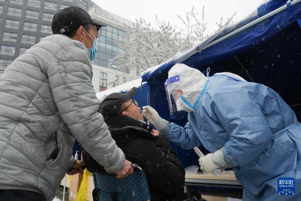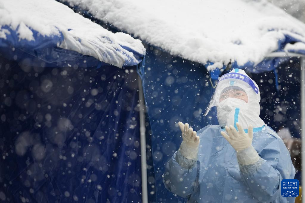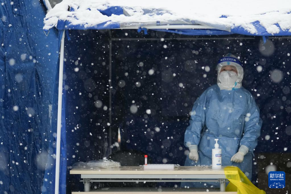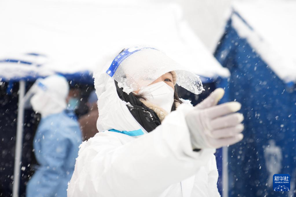 A staff member guides residents in snow at a COVID-19 testing site in Beijing, capital of China, March 18, 2022. (Xinhua/Ju Huanzong)