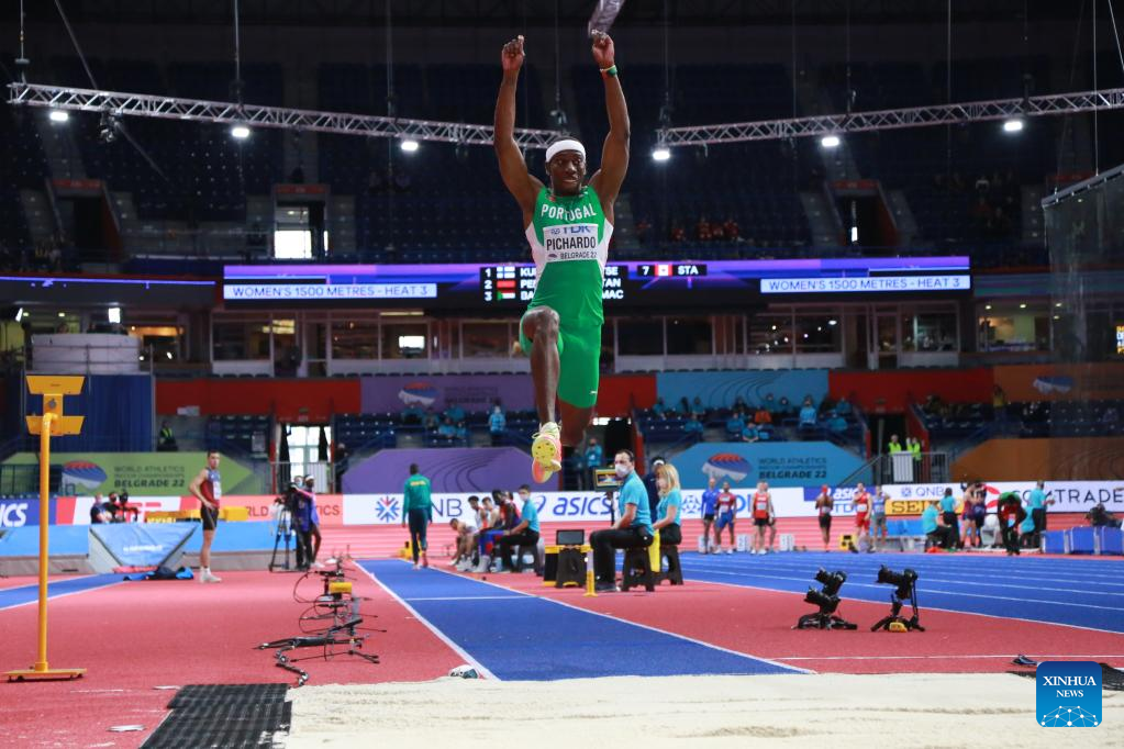 Pedro Pichardo of Portugal competes during the men's triple jump final at the World Athletics Indoor Championships Belgrade 2022 in Stark Arena, Belgrade, Serbia, March 18, 2022. (Xinhua/Shi Zhongyu)