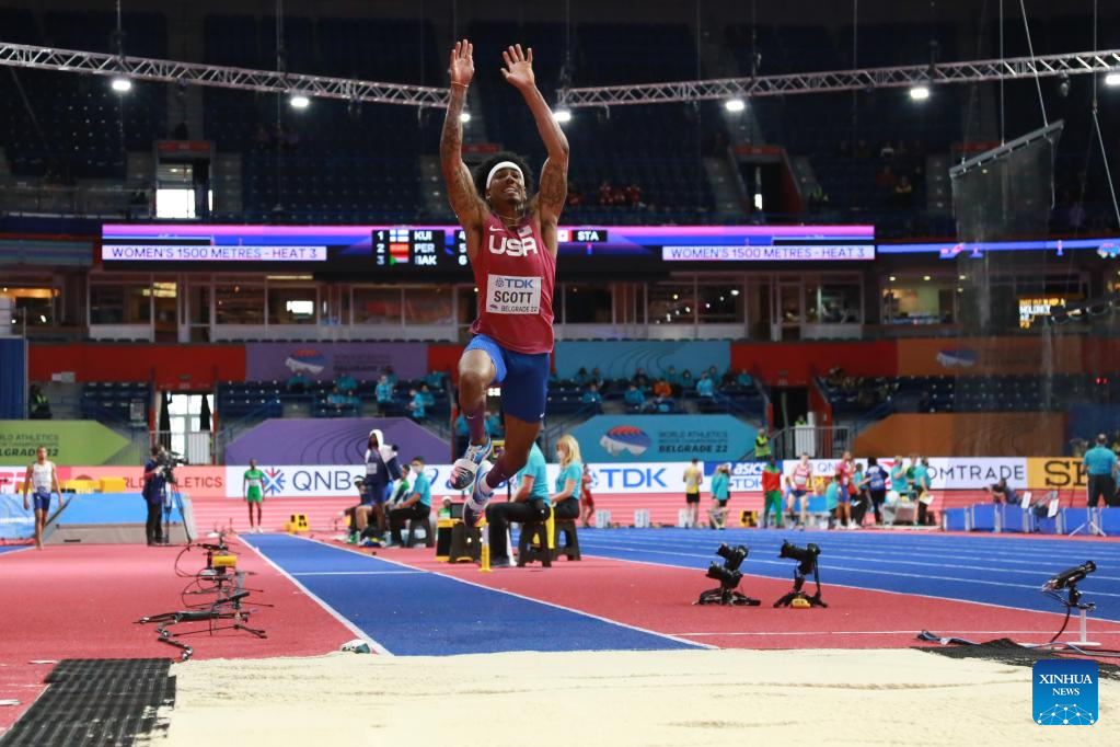 Donald Scott of the United States competes during the men's triple jump final at the World Athletics Indoor Championships Belgrade 2022 in Stark Arena, Belgrade, Serbia, March 18, 2022. (Xinhua/Shi Zhongyu)