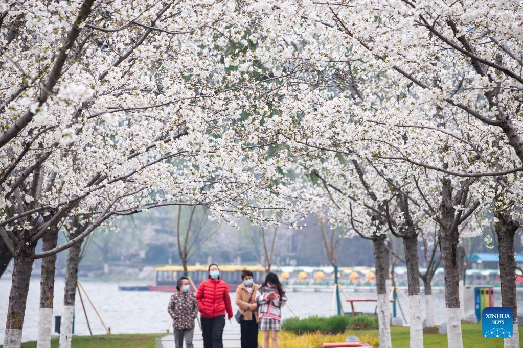 Tourists visit the Xuanwu Lake scenic spot in Nanjing, capital of east China's Jiangsu Province, March 19, 2022. (Photo by Su Yang/Xinhua)