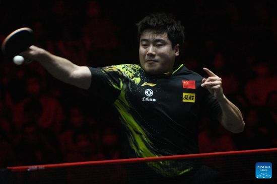 Liang Jingkun of China hits a return during the men's singles semifinal against Ma Long of China at the World Table Tennis (WTT) Singapore Smash 2022 in Singapore, March 19, 2022. (Photo by Then Chih Wey/Xinhua)