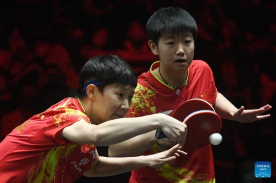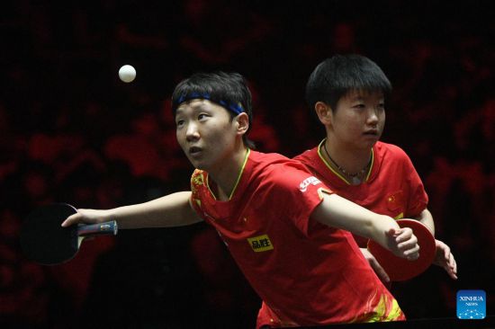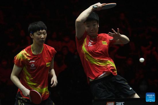 Wang Manyu (L)/Sun Yingsha of China compete during the women's doubles final match between Wang Manyu/Sun Yingsha of China and Hayata Hina/Ito Mima of Japan at the World Table Tennis (WTT) Singapore Smash 2022 in Singapore, March 19, 2022. (Photo by Then Chih Wey/Xinhua)