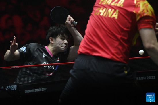 Uda Yukiya of Japan hits a return during the men's singles semifinal against Fan Zhendong of China at the World Table Tennis (WTT) Singapore Smash 2022 in Singapore, March 19, 2022. (Photo by Then Chih Wey/Xinhua)