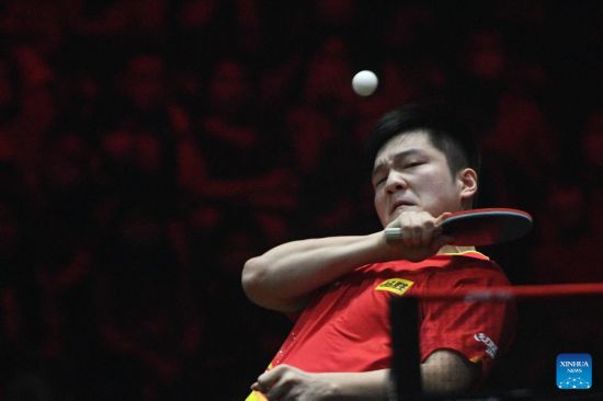 Fan Zhendong of China hits a return during the men's singles semifinal against Uda Yukiya of Japan at the World Table Tennis (WTT) Singapore Smash 2022 in Singapore, March 19, 2022. (Photo by Then Chih Wey/Xinhua)