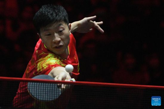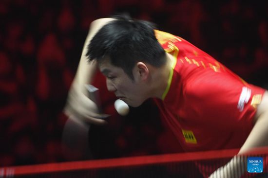 Ma Long of China hits a return during the men's singles semifinal against Liang Jingkun of China at the World Table Tennis (WTT) Singapore Smash 2022 in Singapore, March 19, 2022. (Photo by Then Chih Wey/Xinhua)