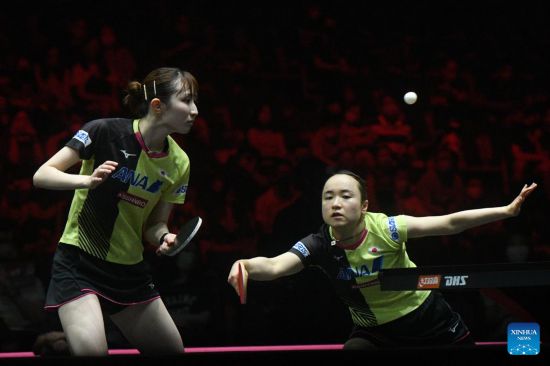 Hayata Hina (L)/Ito Mima of Japan compete during the women's doubles final match between Wang Manyu/Sun Yingsha of China and Hayata Hina/Ito Mima of Japan at the World Table Tennis (WTT) Singapore Smash 2022 in Singapore, March 19, 2022. (Photo by Then Chih Wey/Xinhua)
