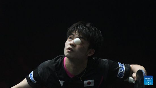 Uda Yukiya of Japan serves during the men's singles semifinal against Fan Zhendong of China at the World Table Tennis (WTT) Singapore Smash 2022 in Singapore, March 19, 2022. (Photo by Then Chih Wey/Xinhua)