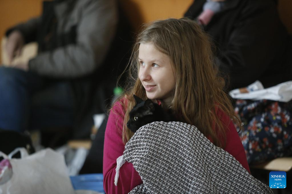 A girl is seen at a temporary settlement site near Mariupol, Ukraine, March 17, 2022. (Photo by Victor/Xinhua)