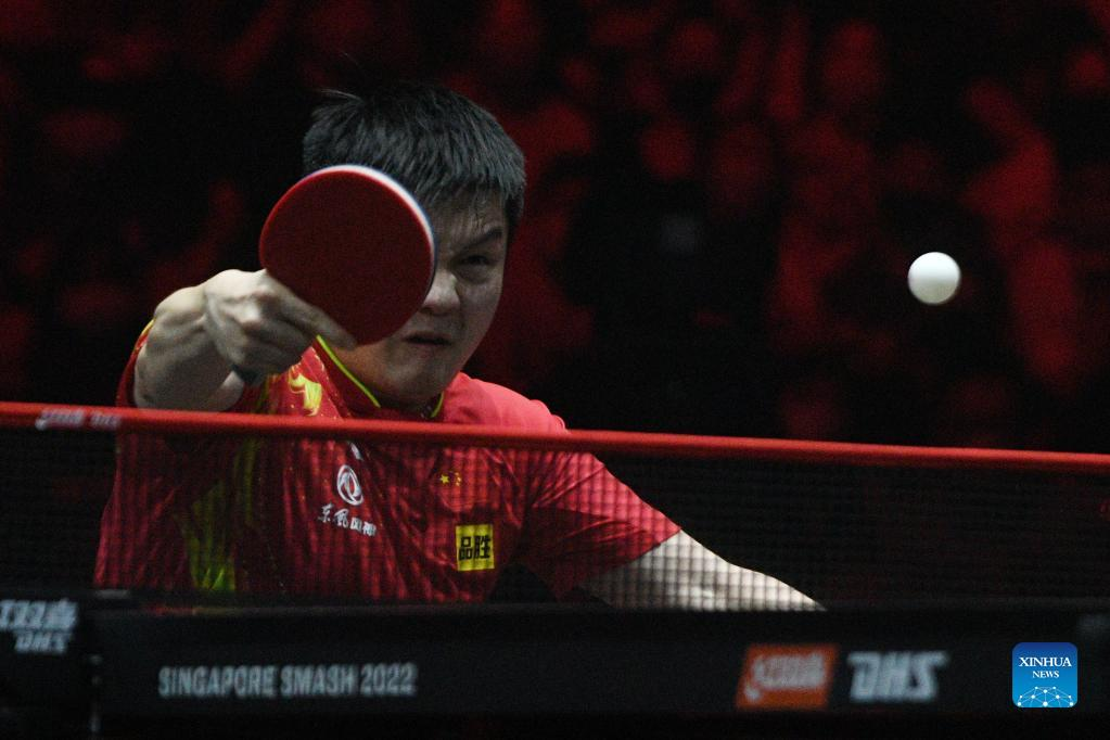 SINGAPORE, March 20 (Xinhua) -- All-time leading team China swept five titles on offer at the World Table Tennis (WTT) Singapore Smash after Chen Meng and Fan Zhendong came out the winners in the women's and men's singles respectively through seven-game thrillers here on Sunday.