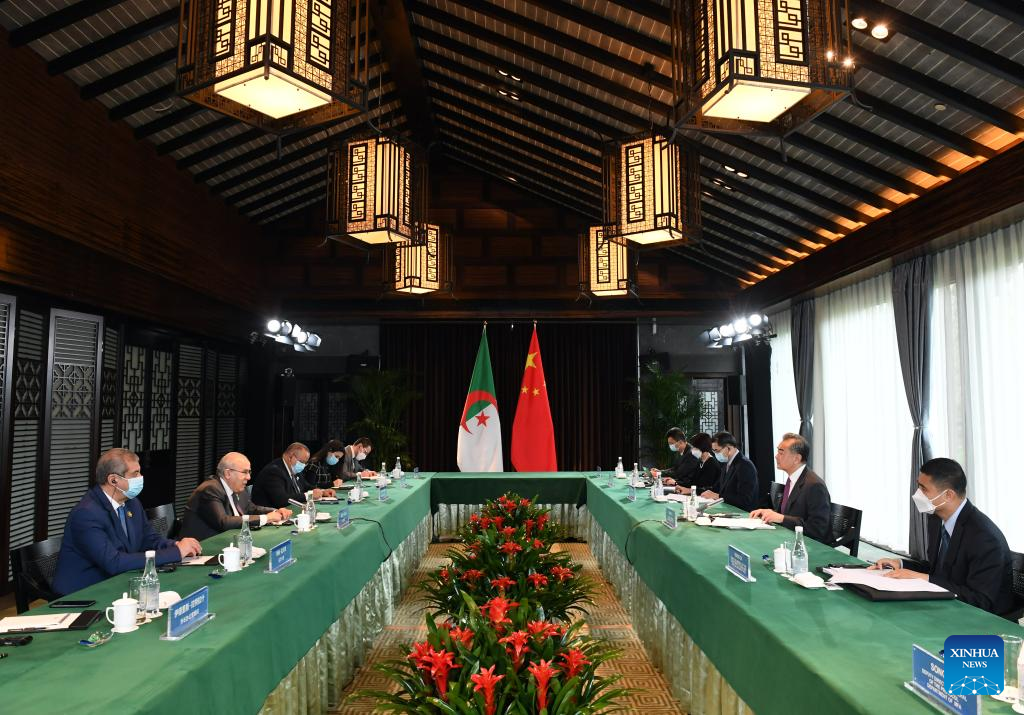 Chinese State Councilor and Foreign Minister Wang Yi holds talks with Algerian Foreign Minister Ramtane Lamamra in Tunxi, east China's Anhui Province, March 20, 2022. (Xinhua/Zhou Mu)