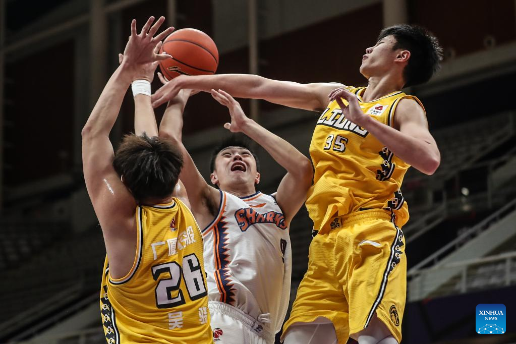 Ju Mingxin (C) of Shanghai Sharks goes to the basket during the 37th round match between Shanghai Sharks and Zhejiang Lions at the 2021-2022 season of the Chinese Basketball Association (CBA) league in Shenyang of northeast China's Liaoning Province, March 20, 2022. (Xinhua/Pan Yulong)